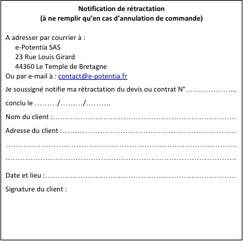 Le client, ayant la qualité de consommateur, est éligible à exercer un droit de rétractation au sens des articles L221-18 et suivants du code de la consommation. Ce droit doit être exercé dans un délai de quatorze (14) jours suivants la conclusion du contrat, en envoyant le formulaire figurant dans l’encadré ci-dessous par courrier à : e-Potentia SAS - 23 Rue Louis Girard – 44360 Le Temple de Bretagne; ou par e-mail à contact@e-potentia.fr.